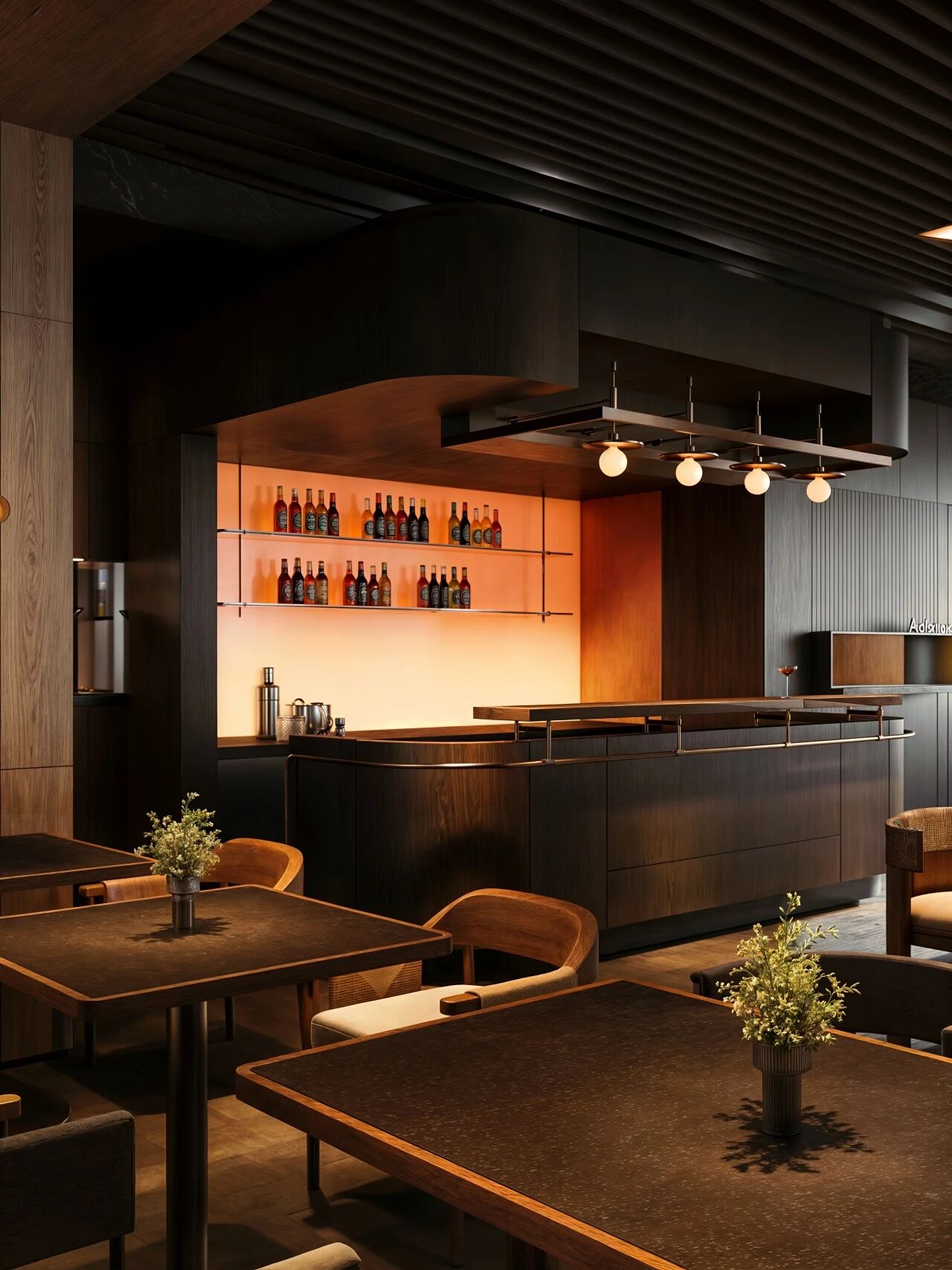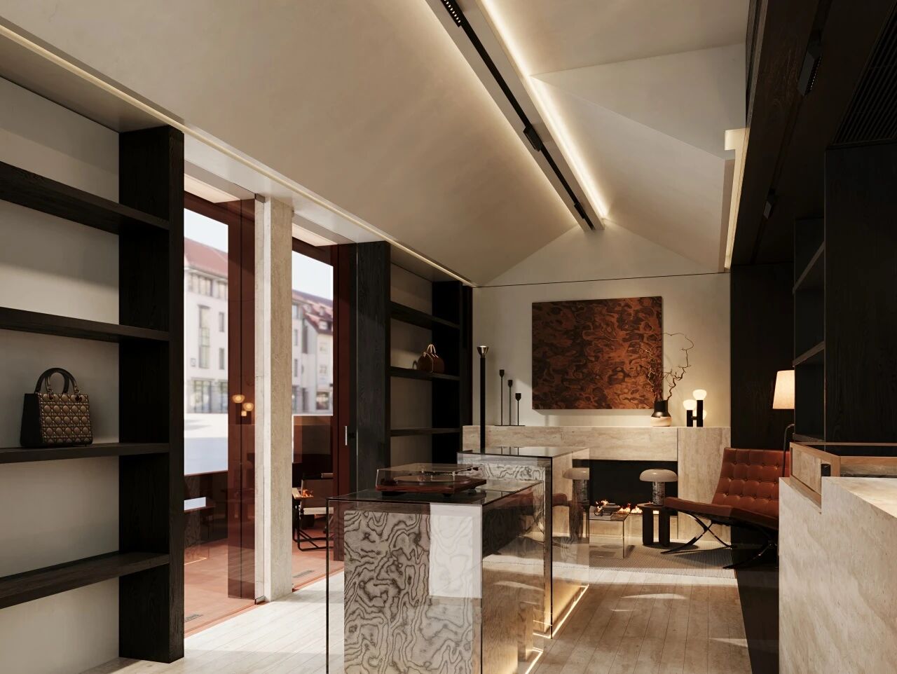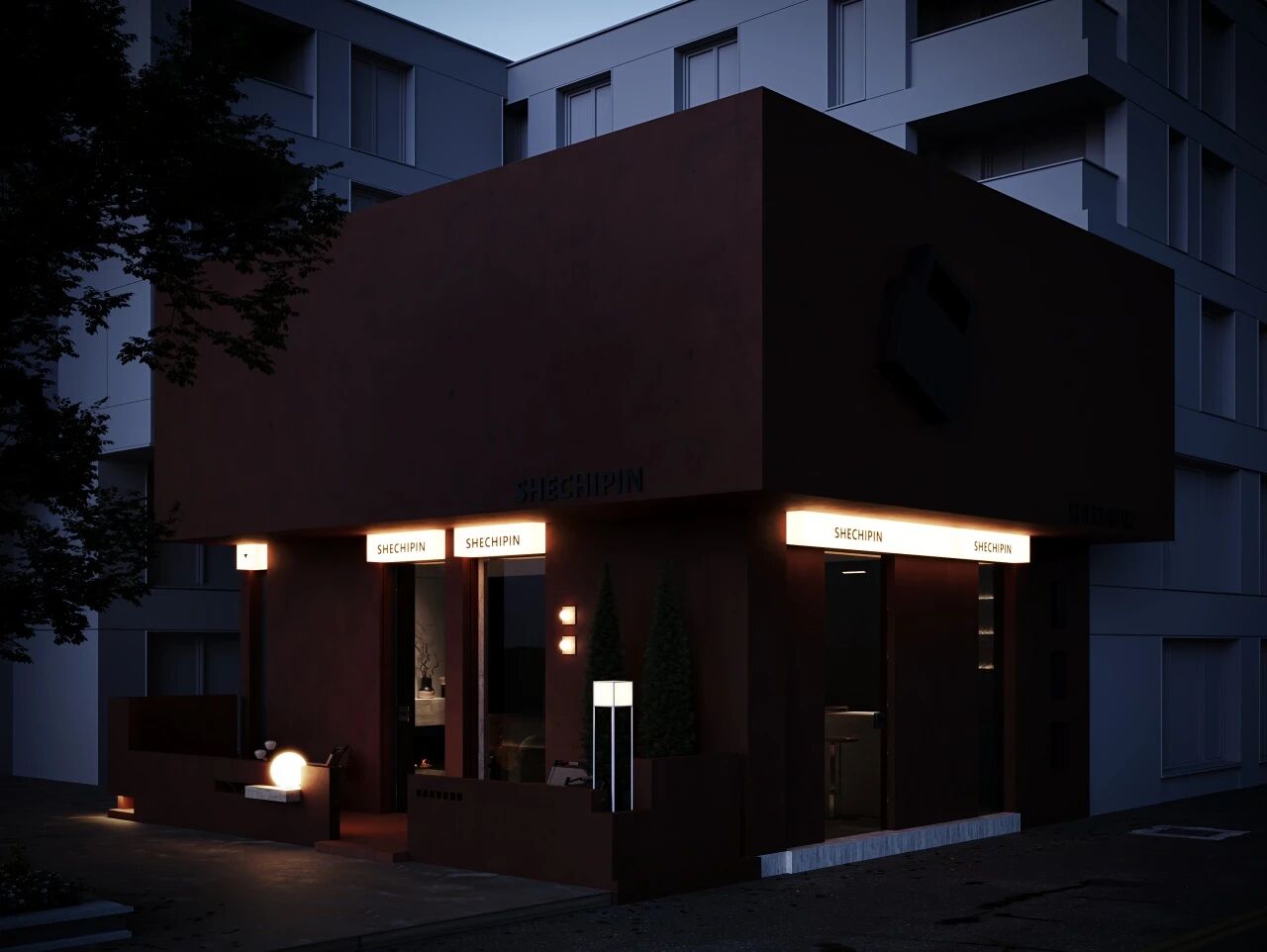 本项目难点在于材质对整体光感的影响。初期因某一材质反射过强,导致空间光感失衡。我们通过“光感-材质-镜头”三位一体的系统优化,逐步调整材质属性与灯光配合,精准控制反射与柔化效果,最终达成高级而协调的视觉呈现。门头部分则依托多维度实景参考,确立效果方向,确保外立面的品牌识别度与艺术性。