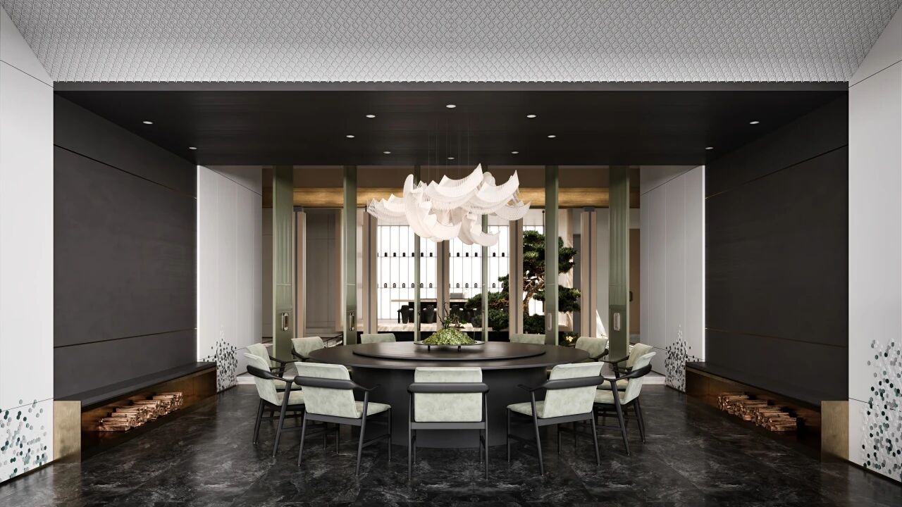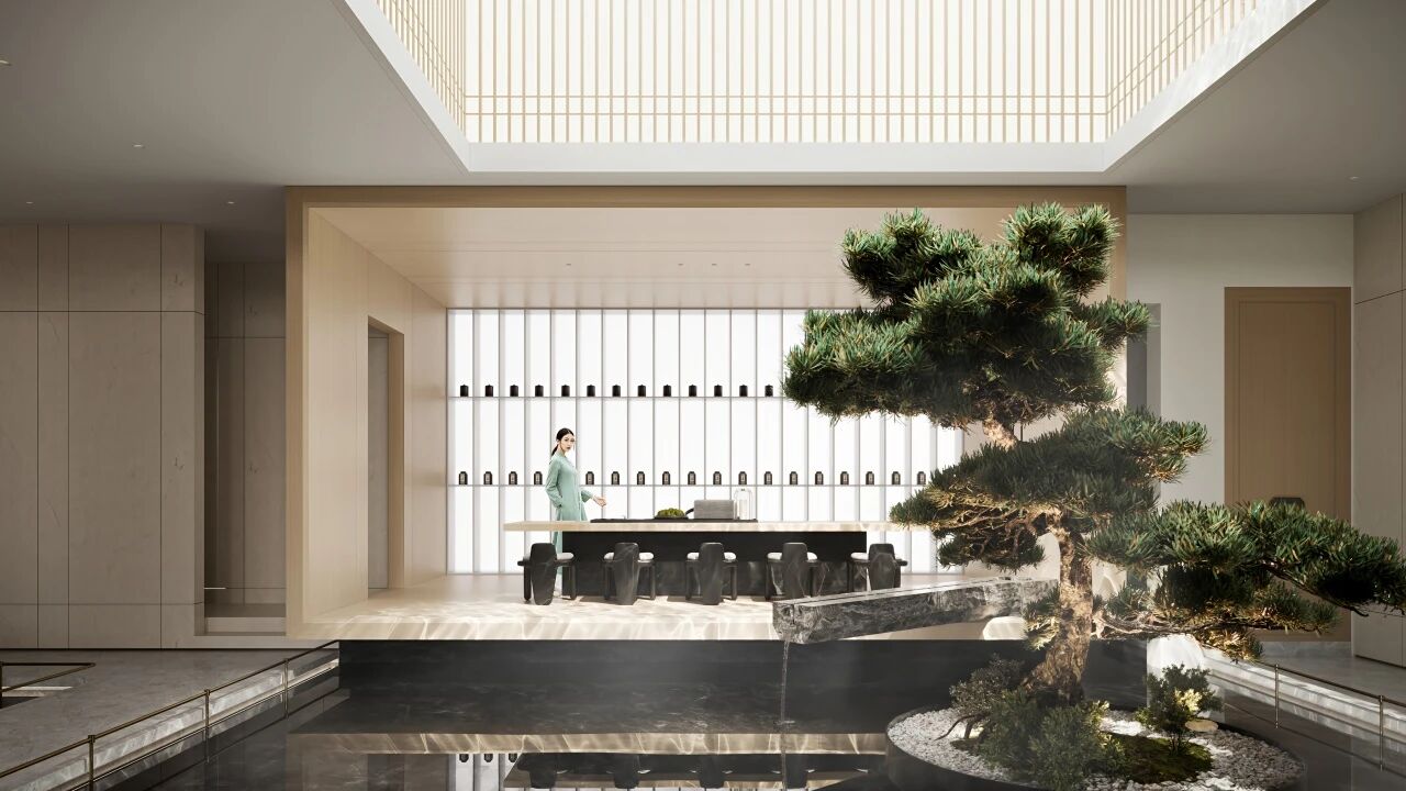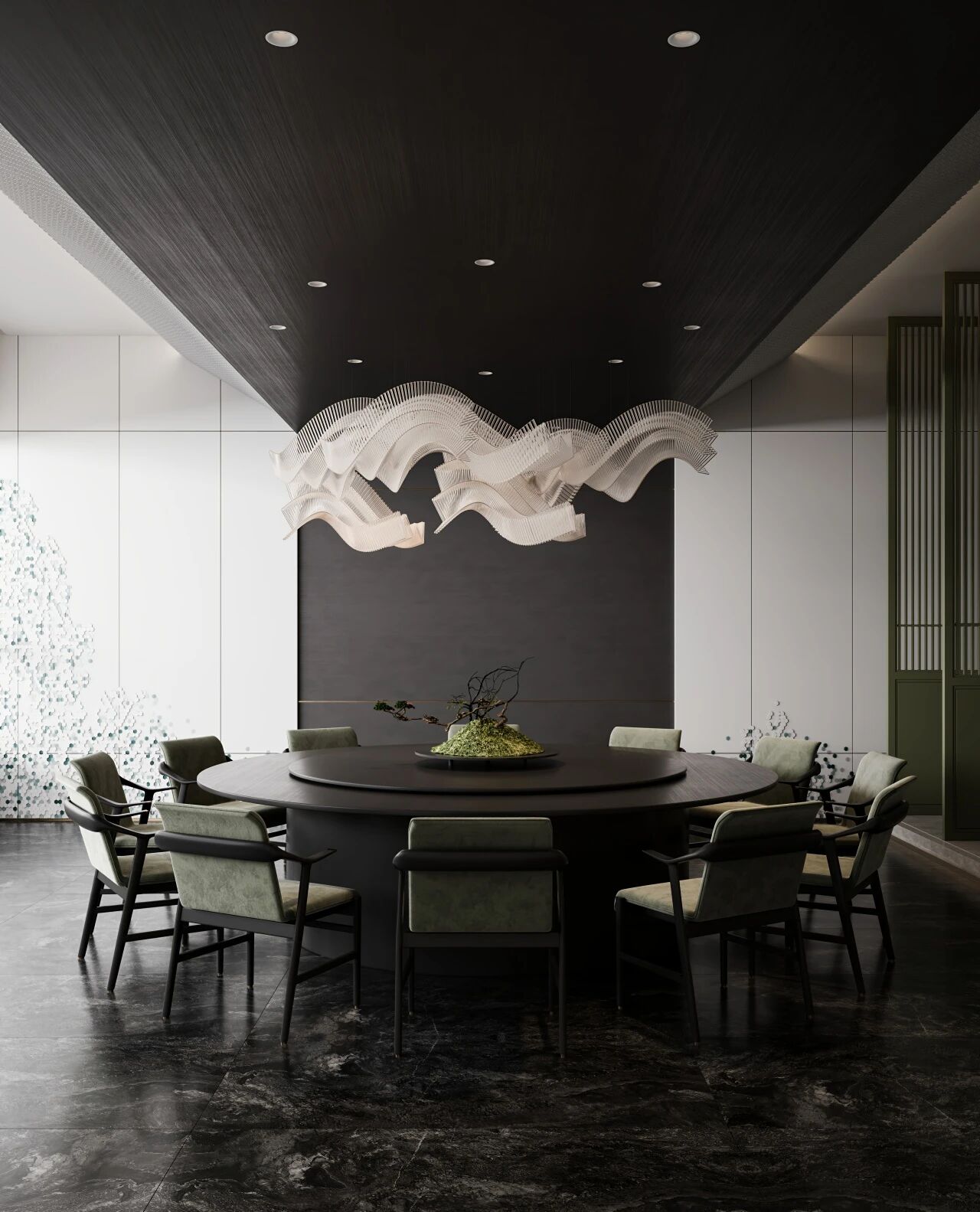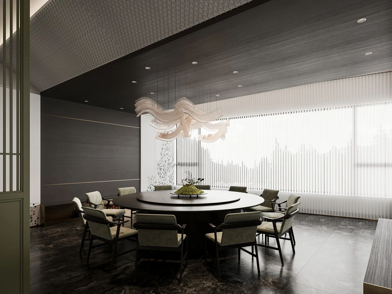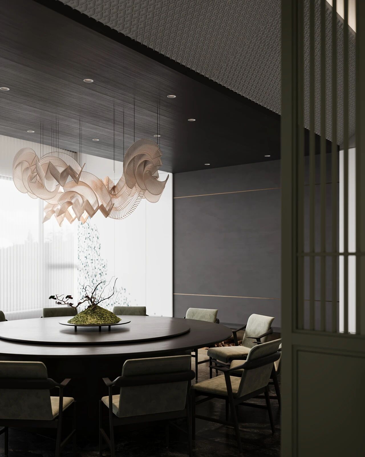 项目位于浙江宁波,为一处融合东方美学与现代功能的商业会所。设计以“办公即修行,洽谈亦赏心”为理念,将中式元素进行现代转译:接待区宫灯造型吊灯结合磨砂玻璃,营造柔和光影;洽谈区茶桌嵌入浅浮雕山水纹,搭配青瓷茶具与枯山水微景观,传递“茶禅一味”的意境;办公区则采用可调节竹编帘,兼顾隐私与通透,体现东方智慧与现代实用性的融合。