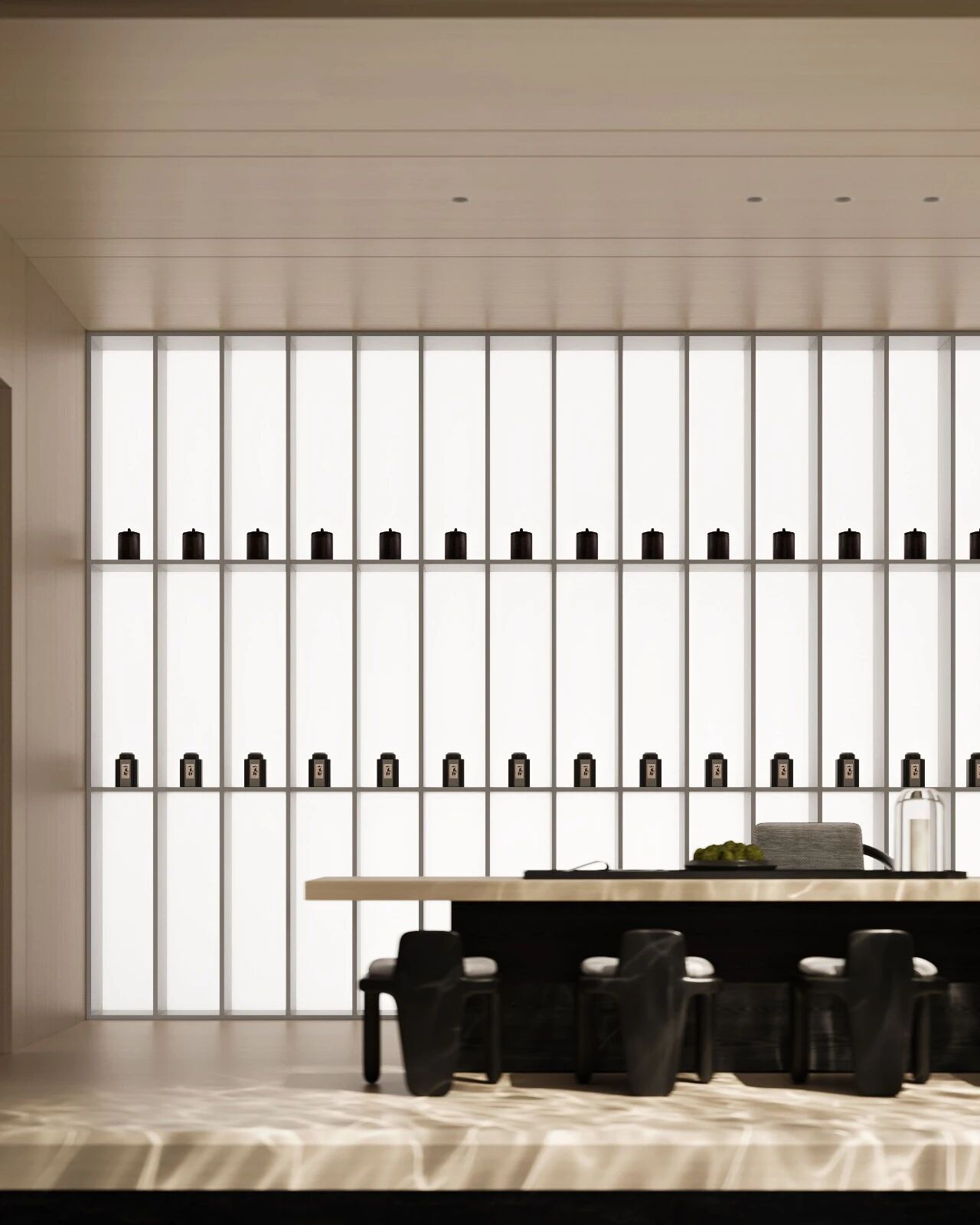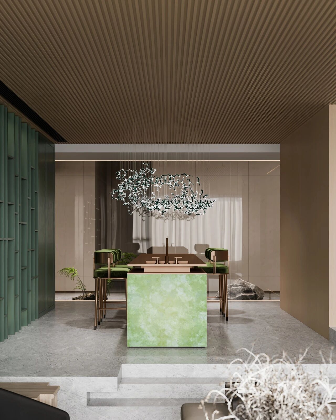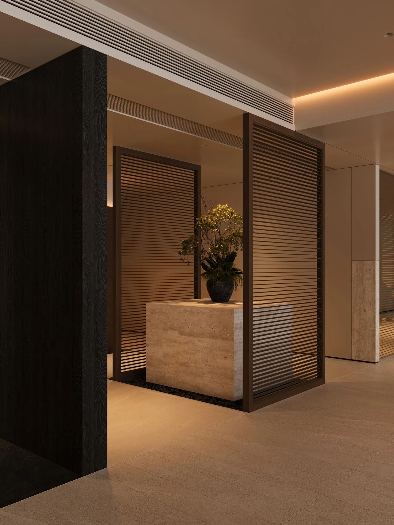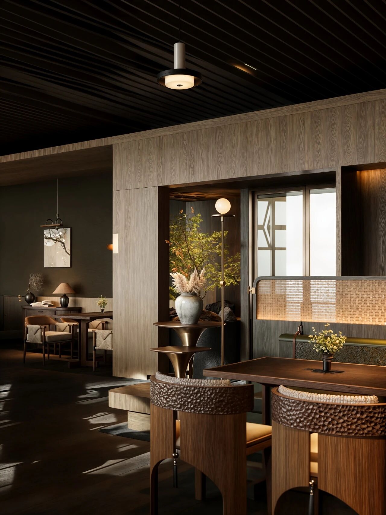 项目位于浙江宁波,为一处融合东方美学与现代功能的商业会所。设计以“办公即修行,洽谈亦赏心”为理念,将中式元素进行现代转译:接待区宫灯造型吊灯结合磨砂玻璃,营造柔和光影;洽谈区茶桌嵌入浅浮雕山水纹,搭配青瓷茶具与枯山水微景观,传递“茶禅一味”的意境;办公区则采用可调节竹编帘,兼顾隐私与通透,体现东方智慧与现代实用性的融合。
