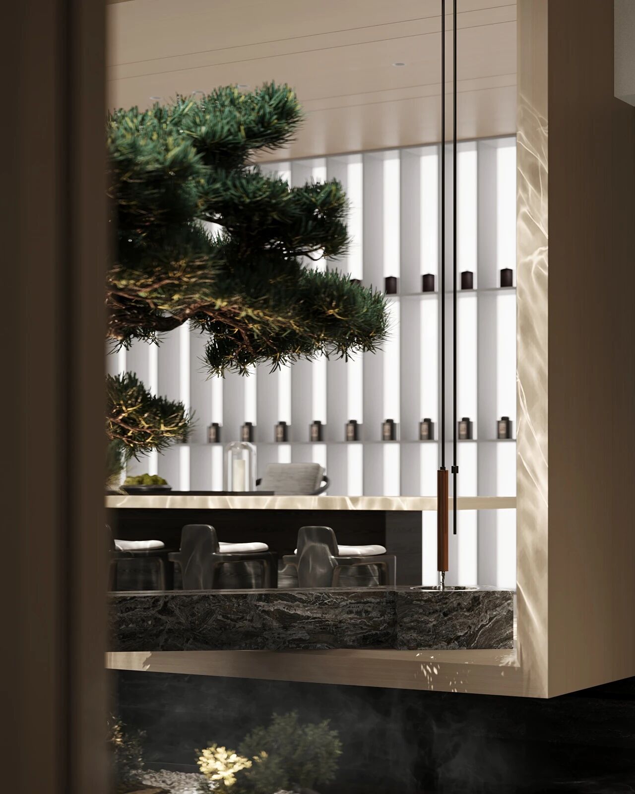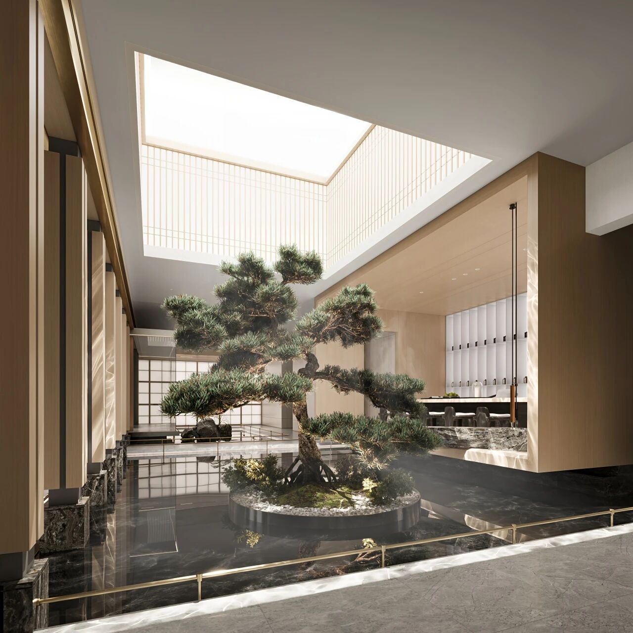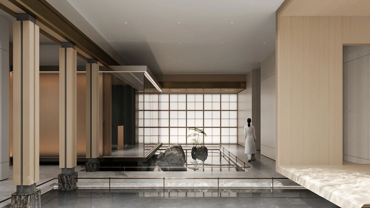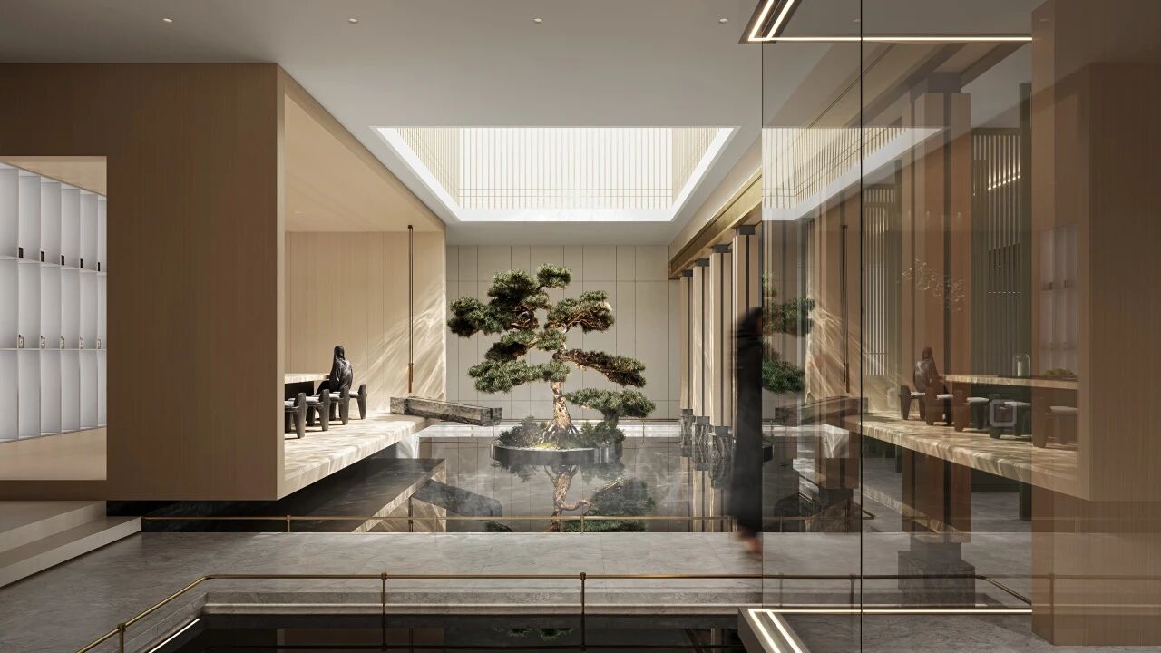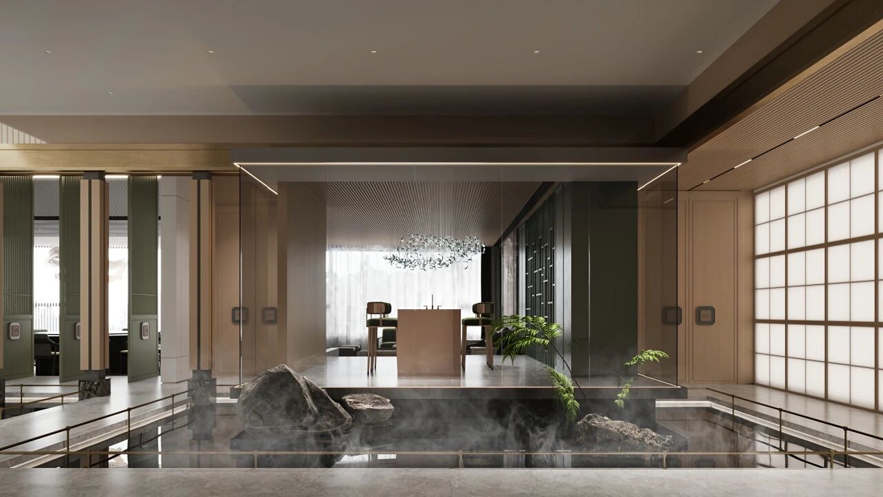 项目难点在于如何在大型工装空间中营造兼具氛围与质感的东方气质,尤其需处理好水景的视觉表现。我重点研究了实景案例中水的焦散效应与雾气效果,力求还原自然灵动的水体形态。通过反复调试灯光与材质,结合设计师的落地配合,最终实现空间情绪与功能体验的高度统一。