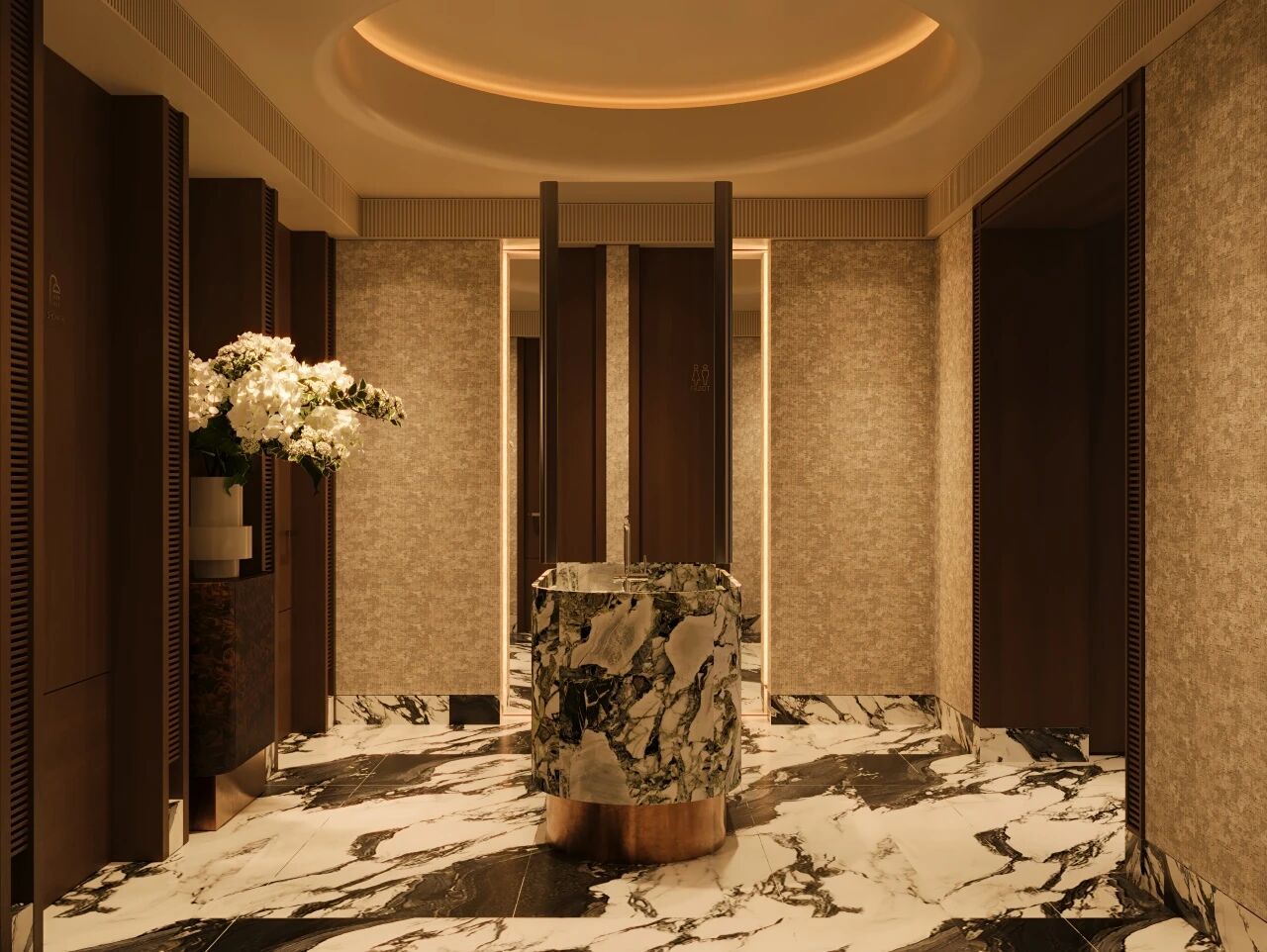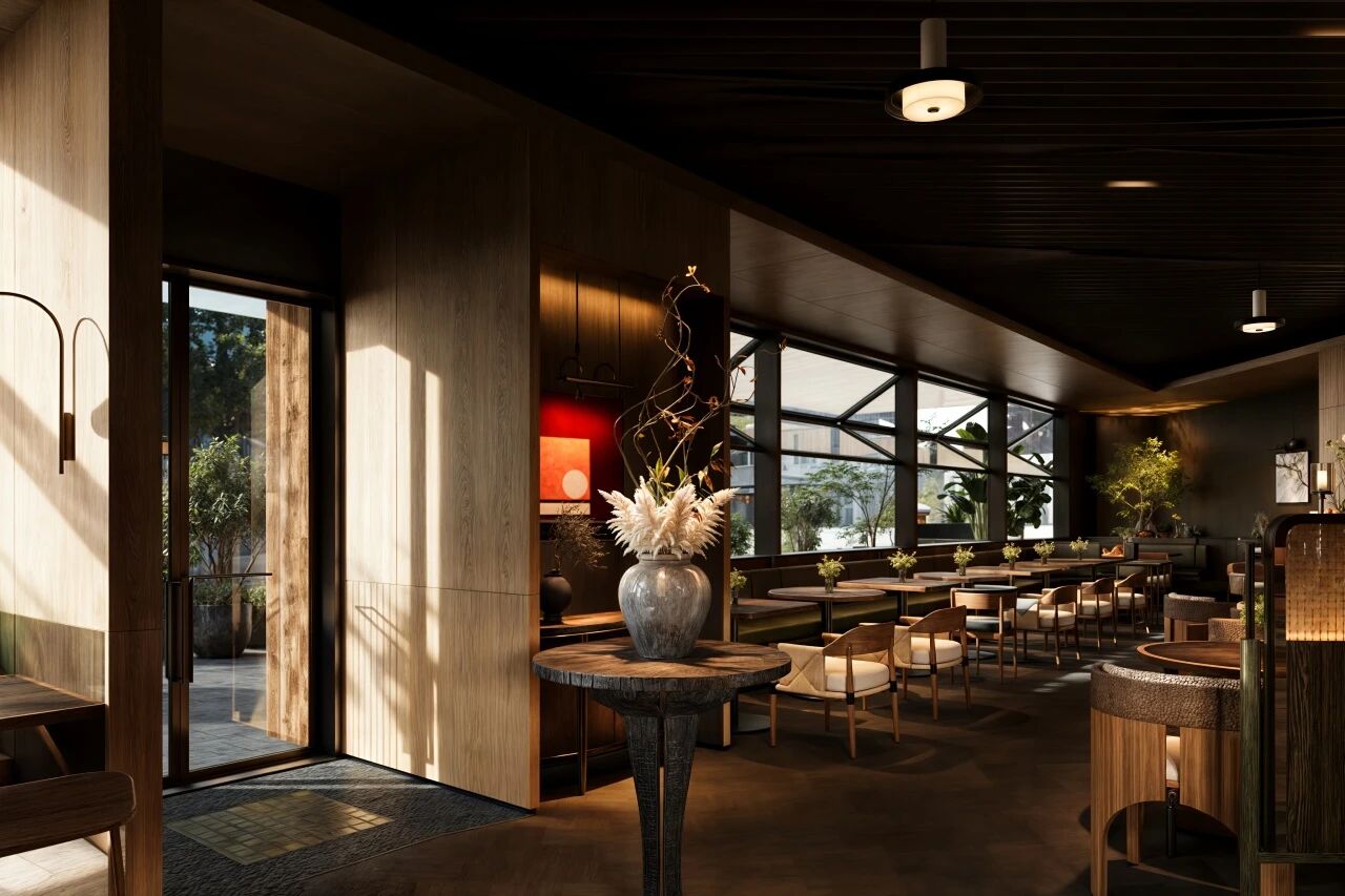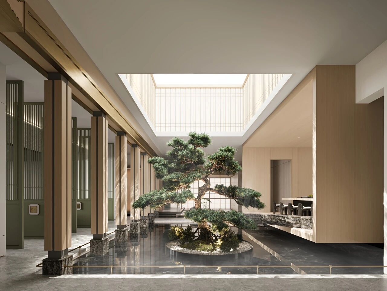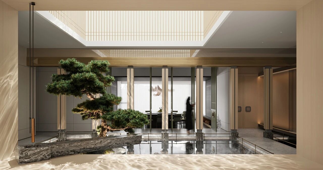 项目难点在于如何在大型工装空间中营造兼具氛围与质感的东方气质,尤其需处理好水景的视觉表现。我重点研究了实景案例中水的焦散效应与雾气效果,力求还原自然灵动的水体形态。通过反复调试灯光与材质,结合设计师的落地配合,最终实现空间情绪与功能体验的高度统一。