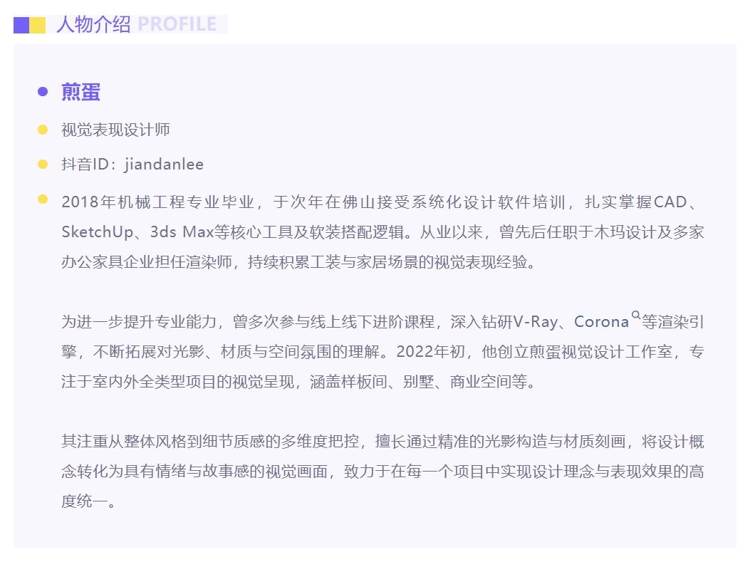 在效果图制作中,如何精准地传达设计理念,赋予空间情绪与生命力,是每位视觉表现师不断探索的课题。本期,渲云邀请到专注于此的视觉表现设计师——煎蛋,分享他的三个实战案例。