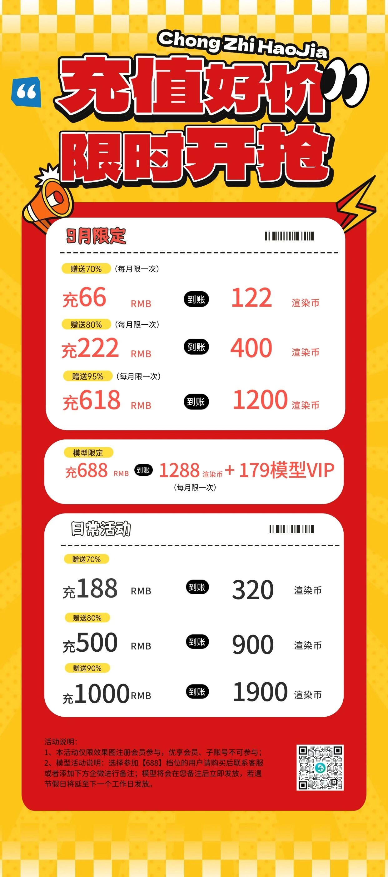 正值秋日,渲云推出限定宠粉充送活动,最高充值赠送额度高达95%,多档位优惠满足您不同的项目渲染需求。小伙伴们可关注下方活动海报了解详情(ノ ̄▽ ̄)