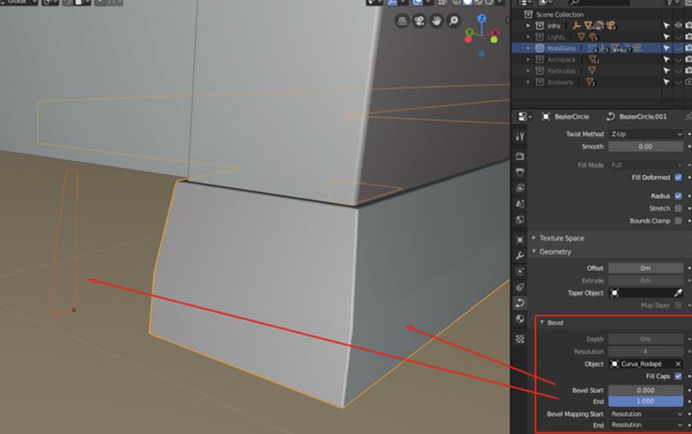 一个不错的细节:我用两条曲线对踢脚板进行了建模。一条曲线与墙壁的形状相同,另一条曲线与踢脚线的形状相同。这是在 Blender 上制作踢脚线和天花板造型的最快方法。
