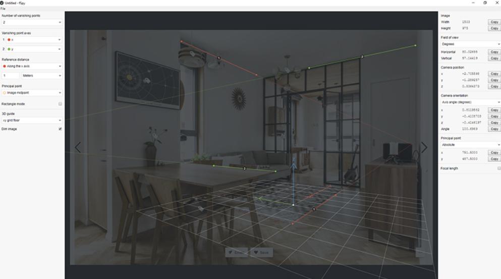 在这个项目中,我无法访问平面图,所以我不得不即兴发挥。我使用了一个名为 FSPY 的新软件来正确放置相机。它是由具有相同功能的 BLAM 的相同开发人员创建的。您在场景上设置一些参考线来标记消失点,它会自动为您创建摄像机。之后,您只需将 .fspy 导入 Blender。