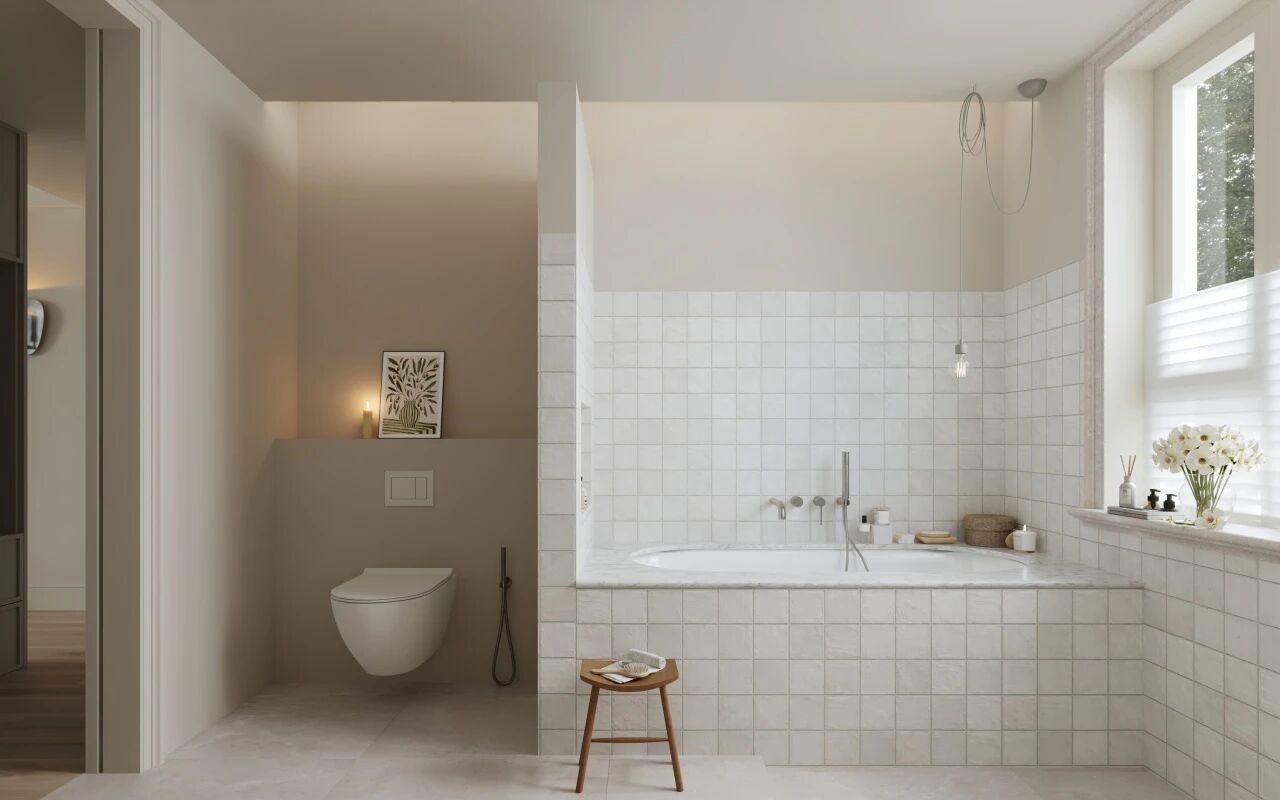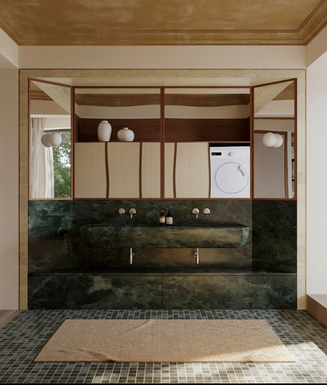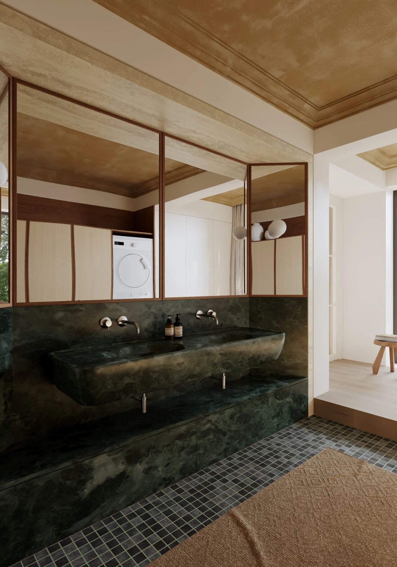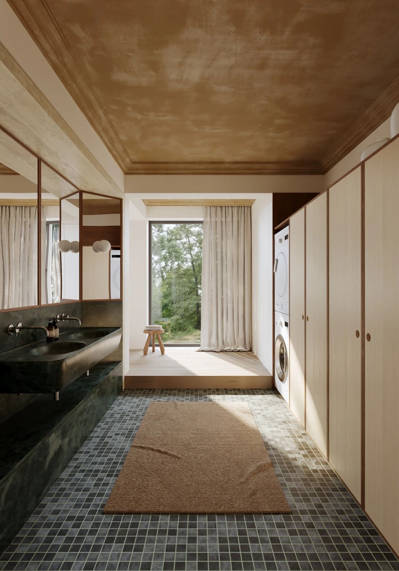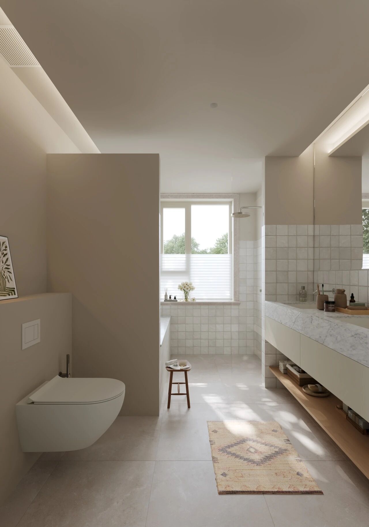 本案融合法式风格与折中主义理念,整体以暖色调营造温暖且富有层次的空间情绪。项目难点集中于硬装建模阶段,尤其是卫生间区域的双盆洗手台,因结构复杂、卡线密集,建模难度显著。团队通过精准的模型构建与细节打磨,即使白模阶段已展现出优秀的结构美感。