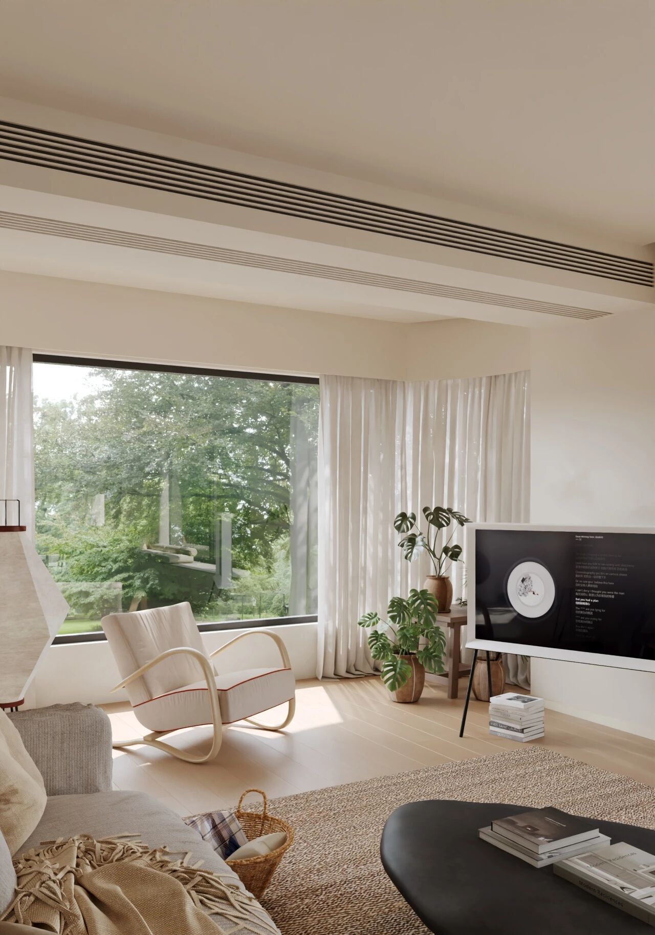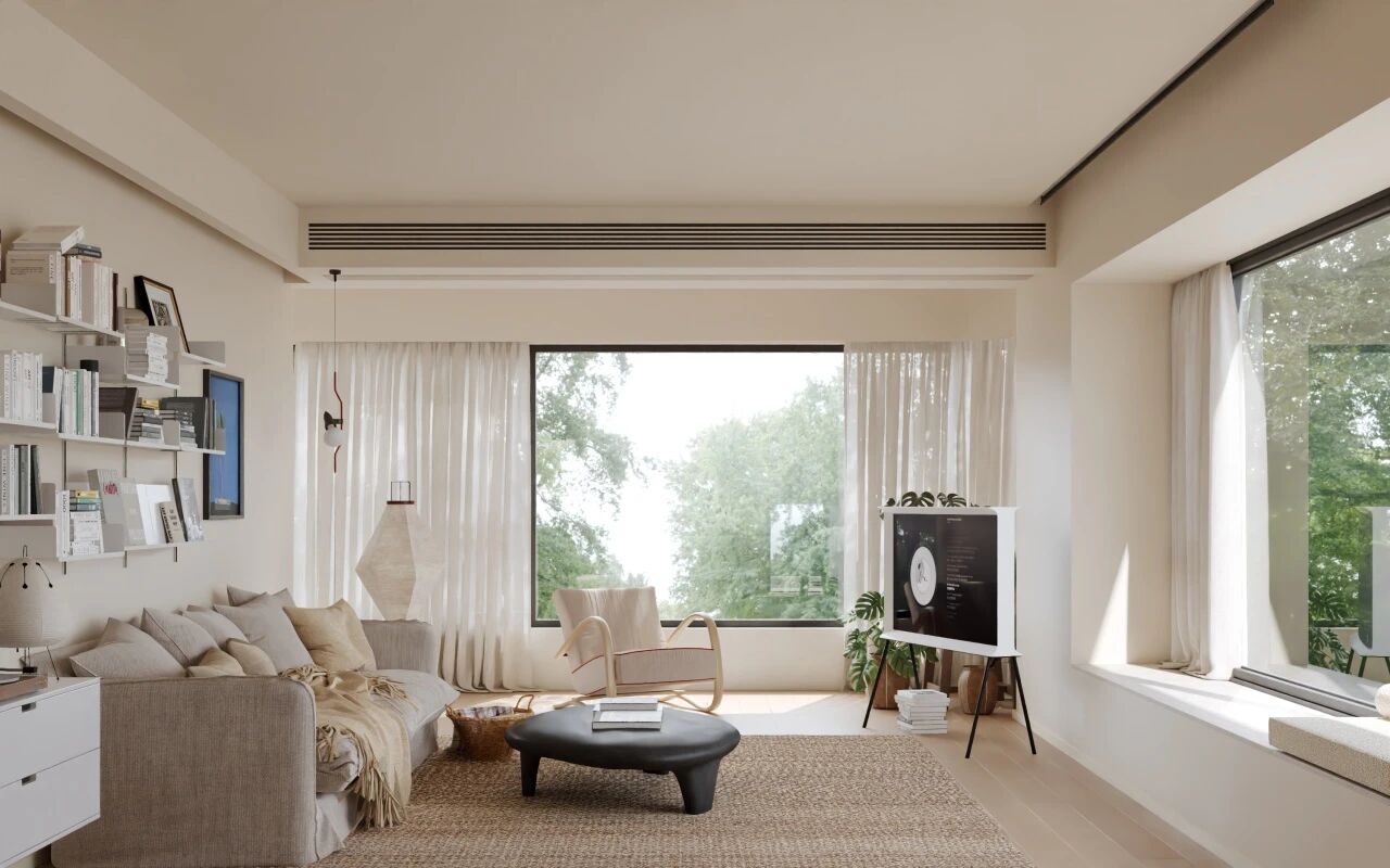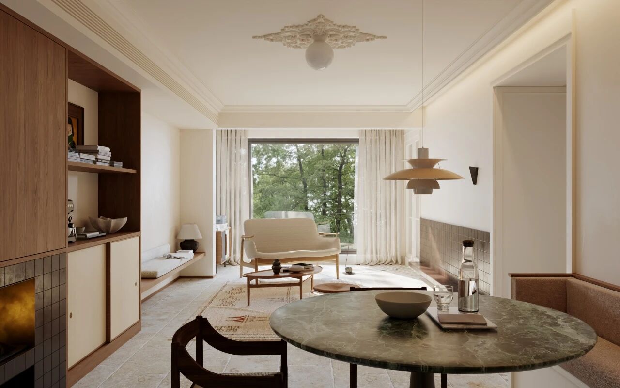 同时,由于空间未设传统电视墙,转而突出窗外景观,如何在保证室内明亮的同时清晰展现外景,成为本项目的主要挑战。为此,团队通过反复调整天光、日照及镜头角度,最终实现了室内外光感的精准平衡。