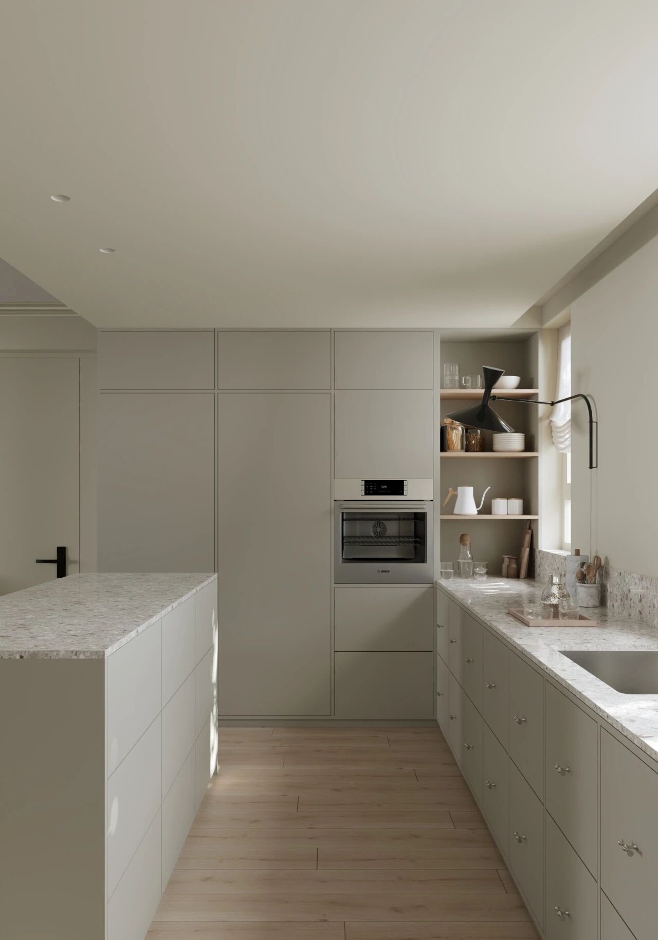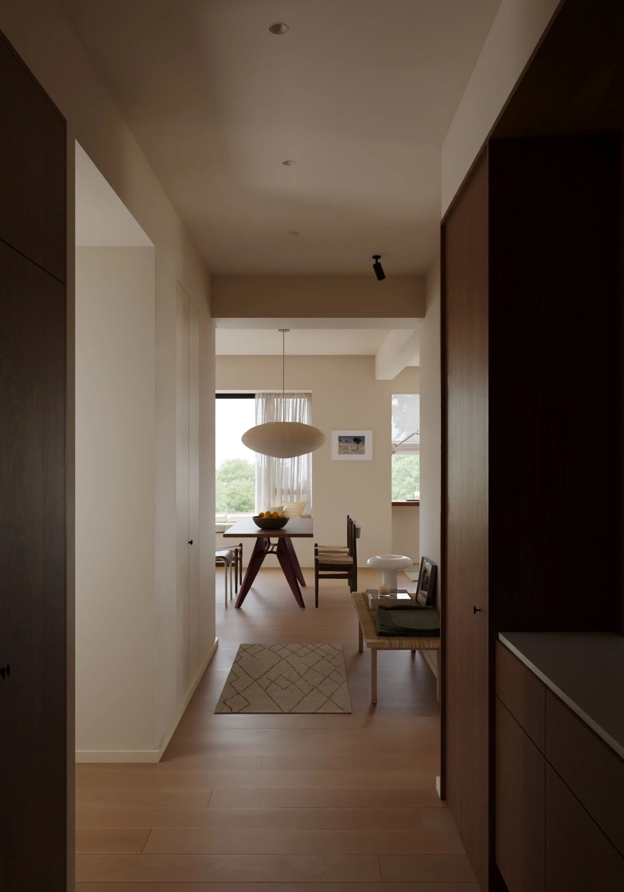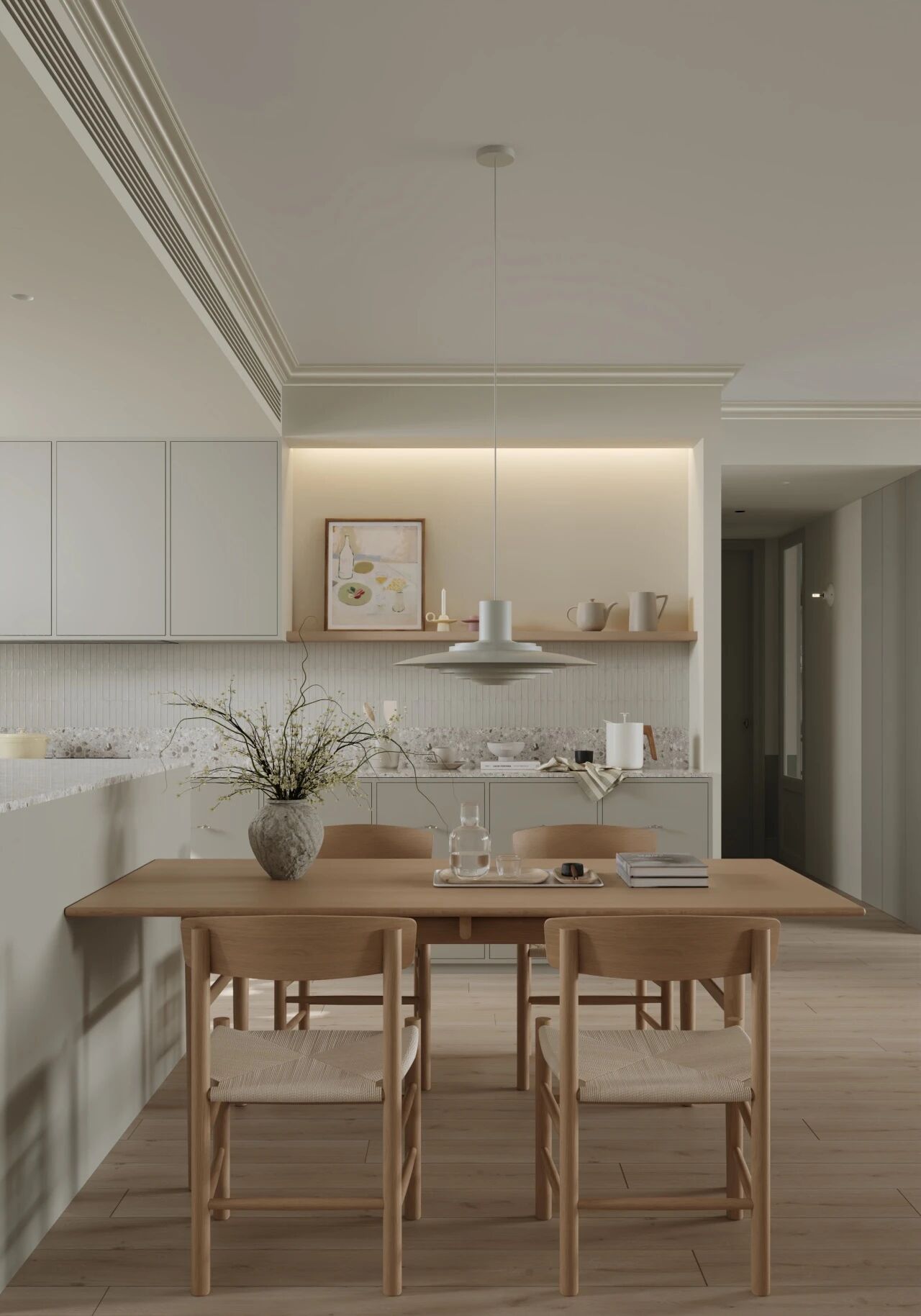 该作品围绕极简风格展开,重点呈现软装搭配与空间构图的和谐关系。团队在设计中不断尝试与更换软装元素,直至达成自然协调的视觉效果。
