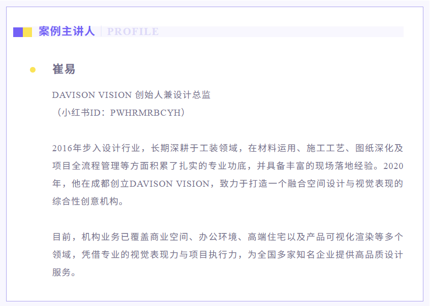 崔易深耕设计行业多年,兼具深厚的工装项目经验与前瞻性的视觉创意表达。本次他将通过北欧、极简、法式折中主义等不同风格的空间案例,深度解析如何在项目中精准把控光影、材质与软硬装细节,为从业者在处理自然光感、复杂建模及整体氛围营造方面,提供具有实践价值的参考。