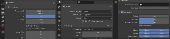 我用了Cycles和内置的Blender降噪器。你可以在这些截图中看到我的渲染设置: