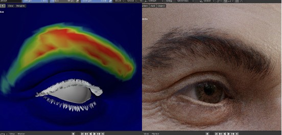 在下面的图片中,你可以看到权重绘制模式下的顶点组和完成的头发粒子系统。