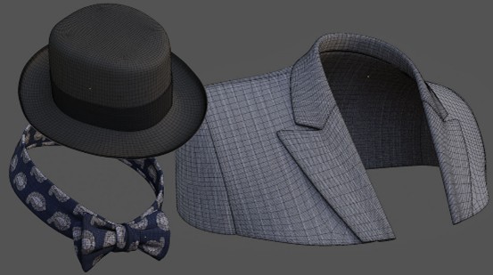 我用同样的方法建模衣服、帽子和领结:网格建模、实体化修改器、细分修改器。我用镜像修改器来处理对称物体,比如夹克或衬衫。