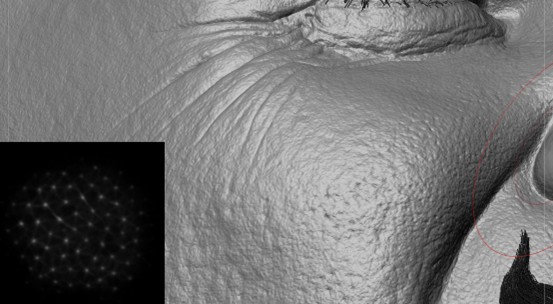 我没有用任何扫描数据来处理面部细节。首先,我添加了程序噪声,然后用标准画笔和皮肤毛孔的alpha(你可以在下方图片中看到),最后用DamStandard画笔和其他内置画笔手动添加剩余细节。
