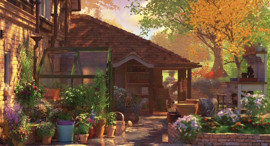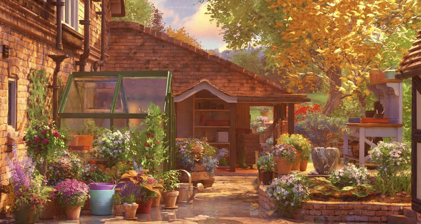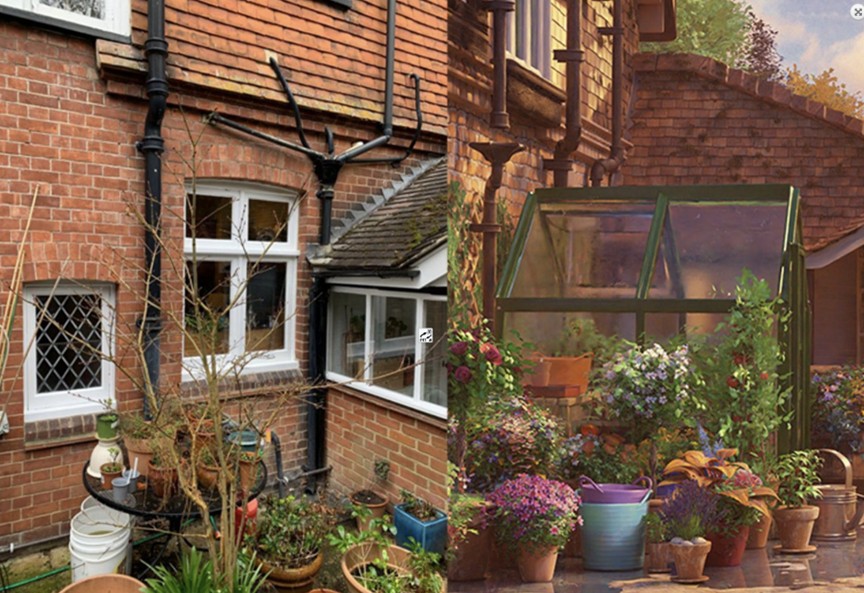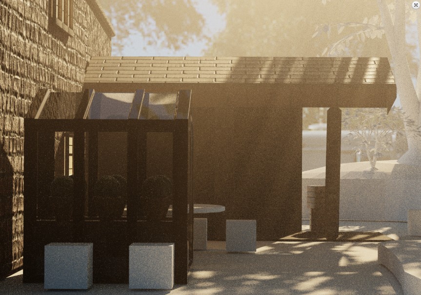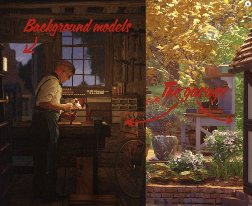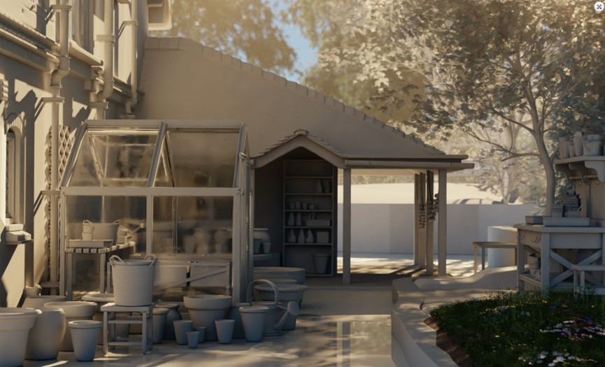 在最初的块状设计中,我拿出了一些我为父亲在车库里的老渲染背景制作的模型。花园的视角很相似,所以我觉得模糊的比例和布局会是一个有用的起点。