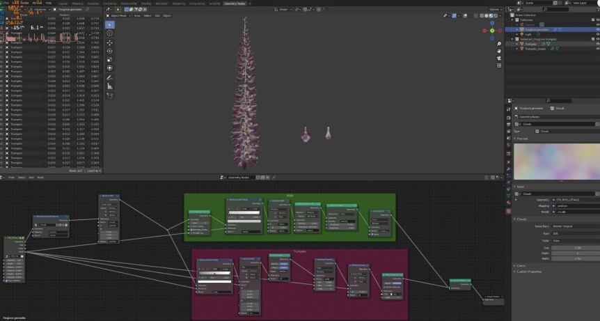 对于毛地黄,我建模了一个开放的铃铛和一个闭合的花苞,并使用了Blender 2.93中的几何节点系统,加上Erindale的叶状节点,创建了整株植物。我按照Erindale的Blender启动画面教程,弄清楚如何建造植物,让闭合的花苞分布在顶部,铃铛分布在底部。我最后手工建模了玫瑰,但我觉得只要花点心思,用几何节点也能做得很漂亮。