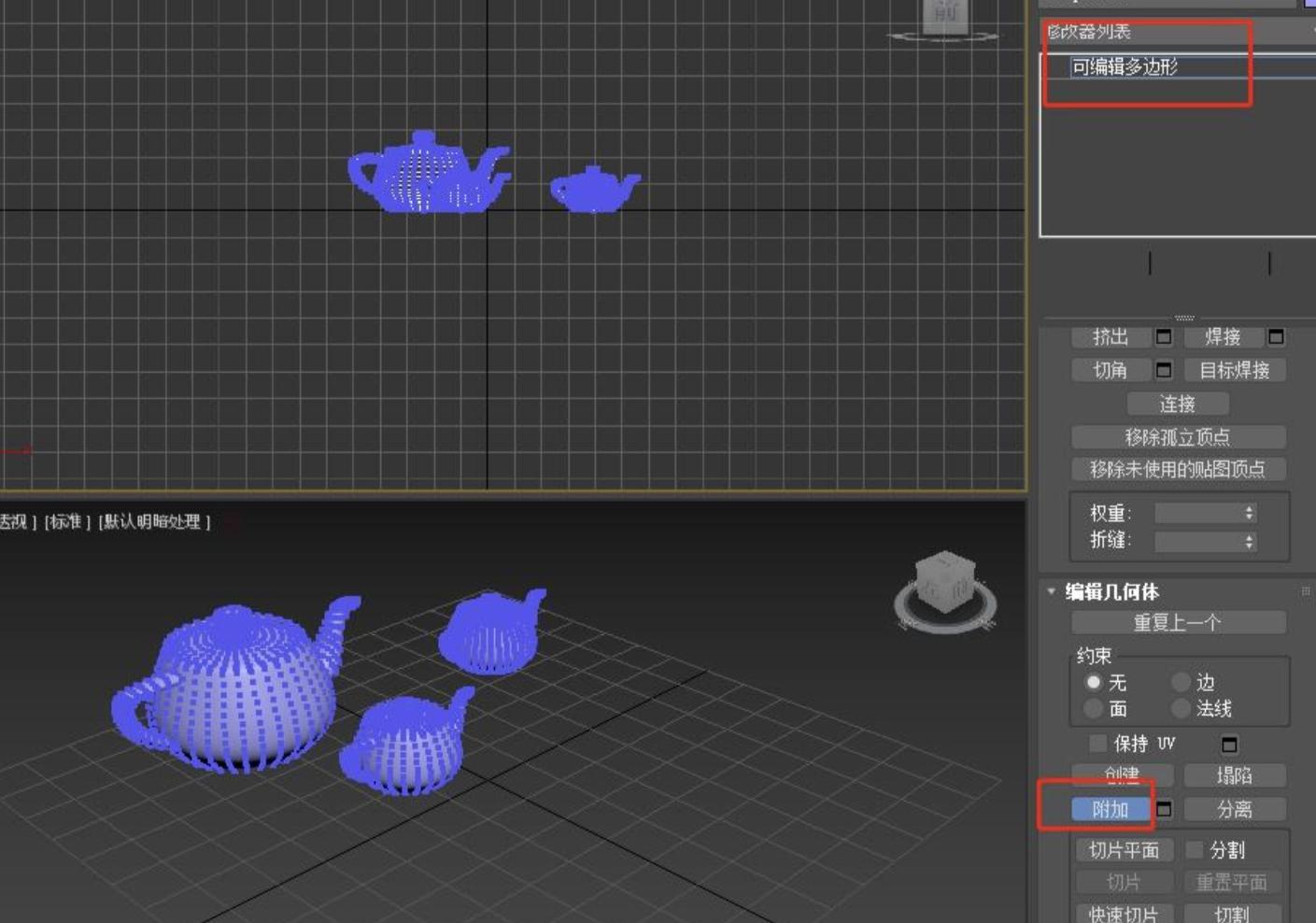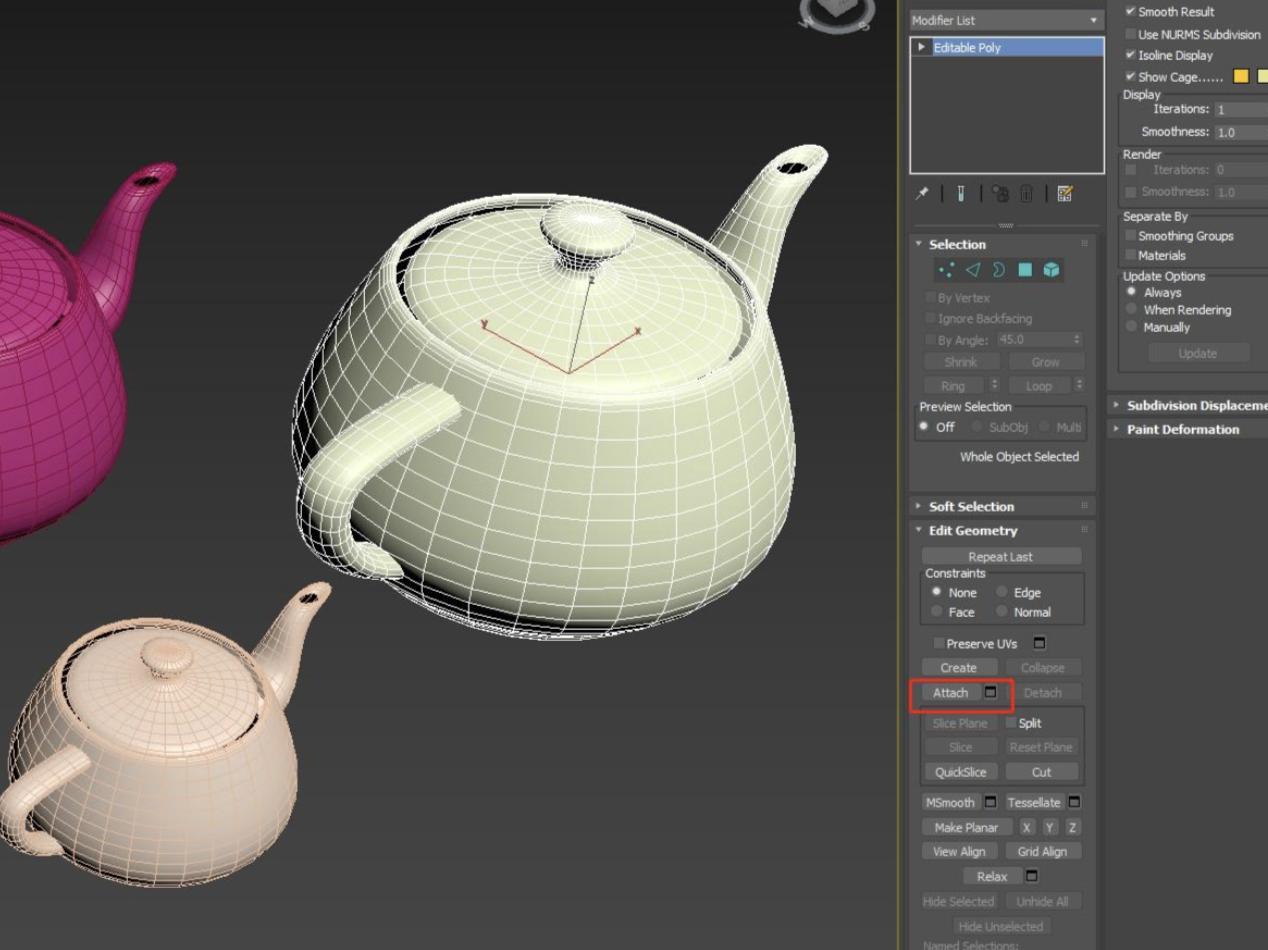 这种方式能够有效减少场景中的模型数量,降低计算复杂度,从而提升软件运行和渲染的流畅度。合并物体的操作方法为:选中其中一个目标物体,在修改面板中点击 “附加” 按钮,再依次选择其他需要合并的同材质物体即可完成整合。