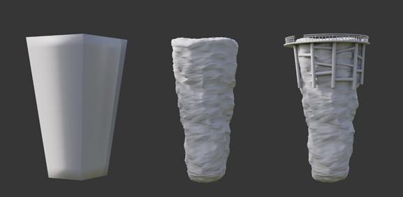 这是我制作这个渲染图的过程。首先是岛屿;我先用一个立方体开始,缩放到看起来像我想要的样子,然后加了一个多分辨率修改器,这样我可以雕刻岛屿,获得更好的形状并增加更多细节。之后为了节省内存,我就直接实例化了岛屿,然后建了第二个岛和岩石。然后,我又在岛台上加了更多细节,比如支撑梁和围栏。