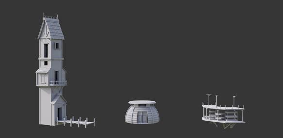 房子方面,我做了三种不同的结构。主结构灵感来自中世纪房屋设计,第二座建筑只是一座看起来像典型树屋的小房子,第三座则设计成蔬菜园。