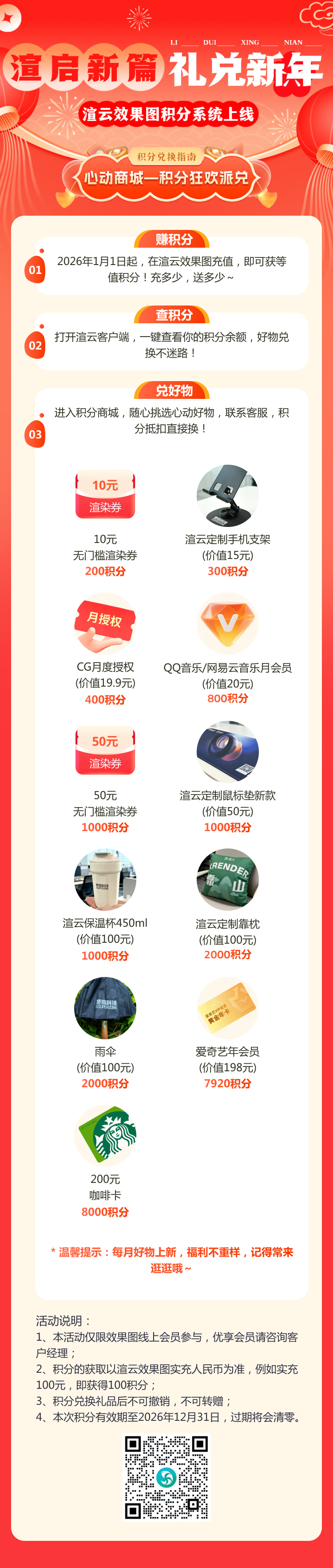 积分有效期至 2026 年 12 月 31 日,且每月都会上新好物,记得常来商城逛逛~(注:本活动仅限渲云效果图线上会员参与,优享会员可咨询客户经理)