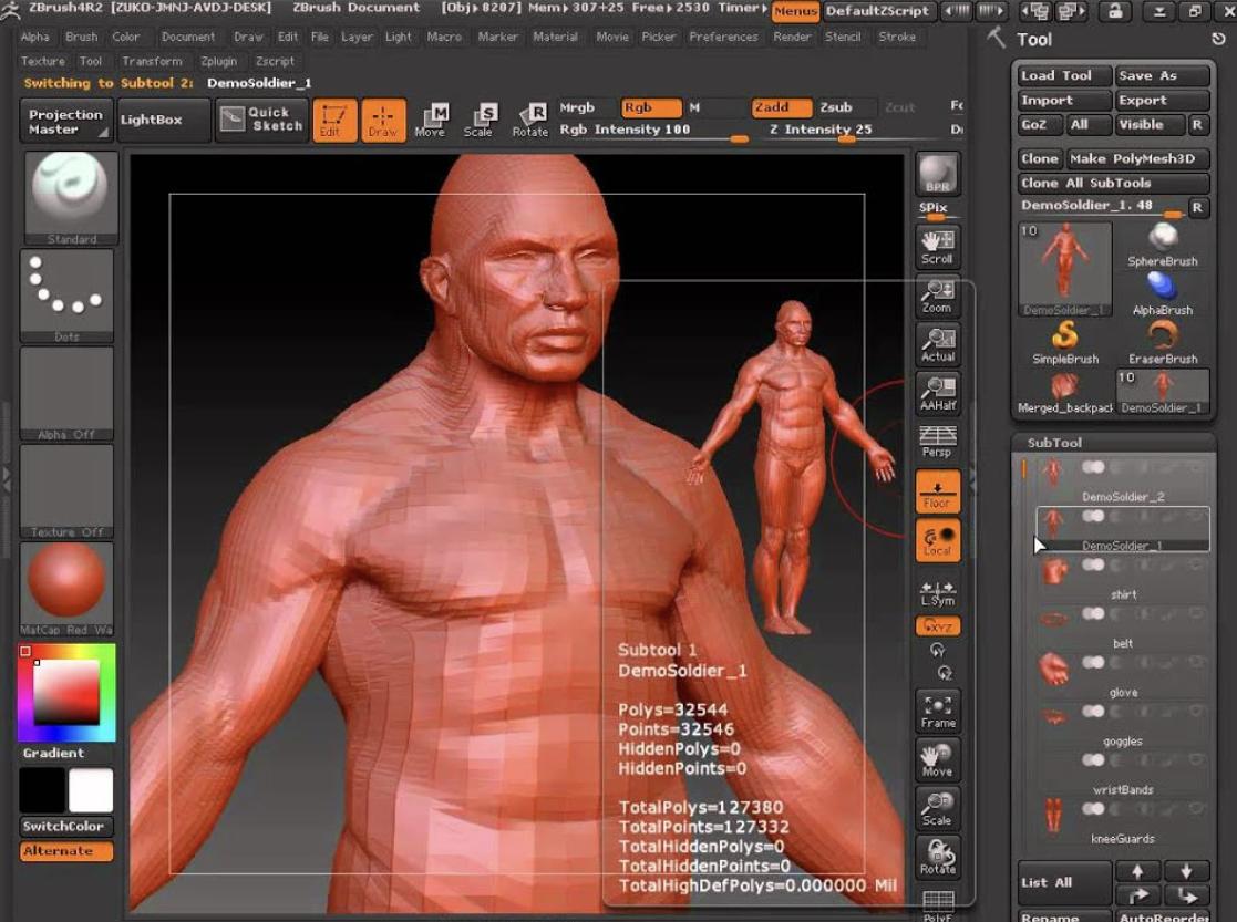 中模细化,重点打造肌肉群的整体形态,搭建角色的力量感与立体感。此时可进一步提高细分级别,聚焦肌肉结构的合理性——人体核心肌肉如胸大肌、背阔肌、腹直肌,需遵循生理结构规律,用“黏土笔刷”堆积肌肉体积,用“减淡笔刷”刻画肌肉间的凹陷与分界线。例如,胸大肌的轮廓需贴合胸腔弧度,腹直肌需呈现分段感,避免刻画过深导致不自然。同时,细化头部五官的大致形态,确定眼睛、鼻子、嘴巴的位置与比例,为后续细节刻画预留空间。