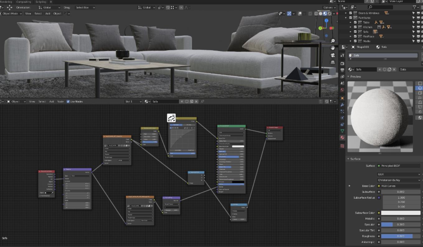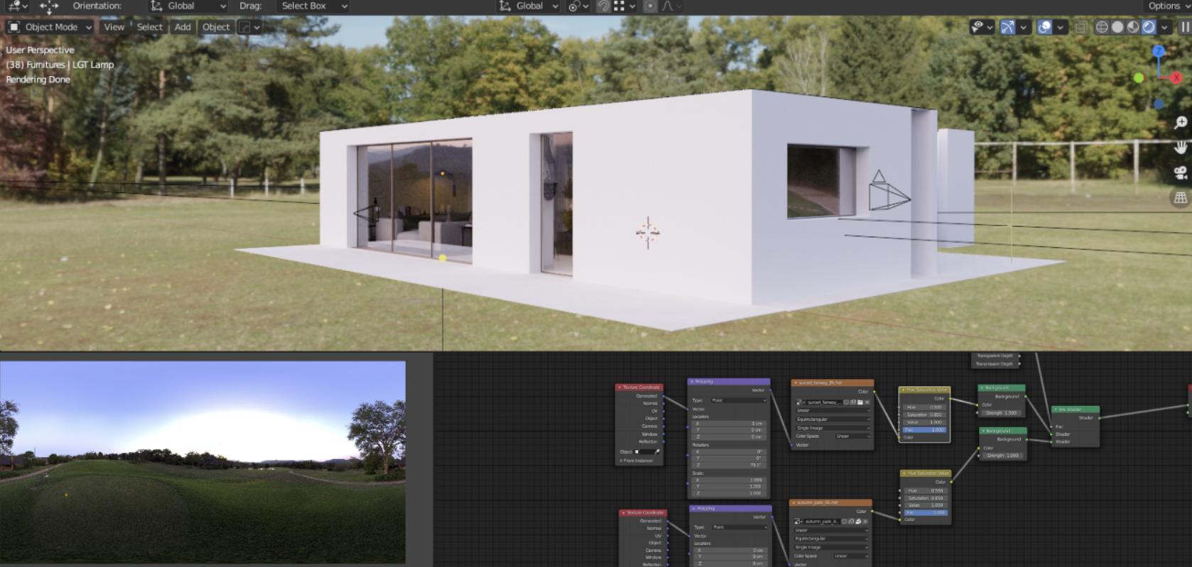 这次的照明是用简单的HDRI(取自HDRI Haven)完成的,并在窗户和门口外加了一些区域灯。