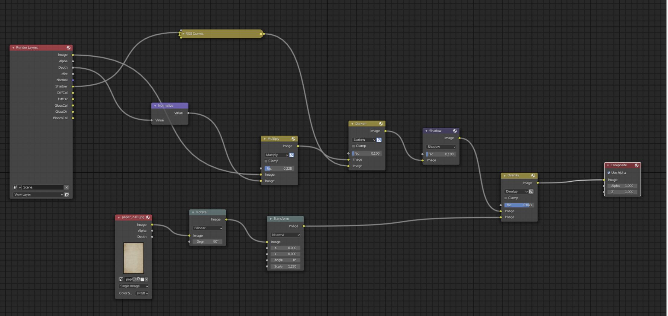 由于我最初的目标之一是尽量减少后期处理,所以我通过添加几个修正节点并在渲染上加一个纸质纹理覆盖,将合成节点数量降到最低。