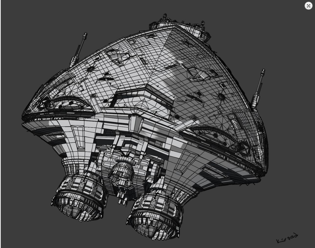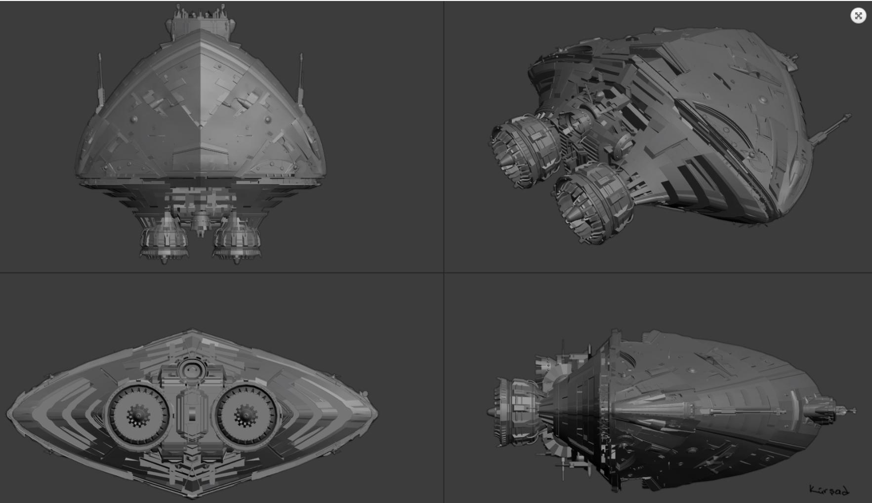 我几乎采用了与反抗军战士相同的设计方法,只是这次设计需要更多细节。需要更多细节的主要原因是这些照片会相对接近页面上的观众。这就是我依赖拼装的原因。我用之前项目的零件来营造这艘船,营造出规模感和体积感。需要说明的是,由于我选择的风格,我并不想要电影级别的几何细节。我用镜像修改器和二分割选项尝试不同设计和不同部件。镜像修改器设置为中心和旋转使用自定义对象,这样我可以轻松地移动和旋转镜子中心,同时尝试不同想法。