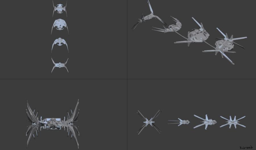 敌舰必须看起来有趣。这就是我先关注她们轮廓的原因。为了让它们看起来更具威胁感,我在模型中装饰了它们带刺的翅膀和昆虫特征。我再次依赖镜像修改器和二分割选项来设计这些设计。