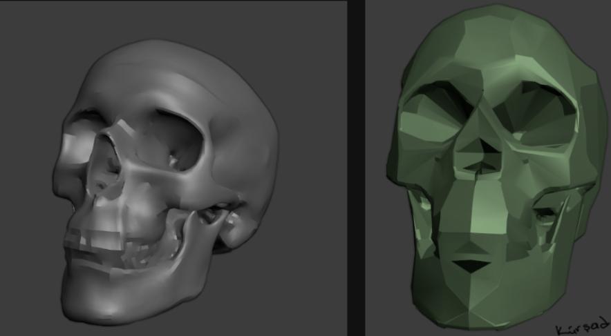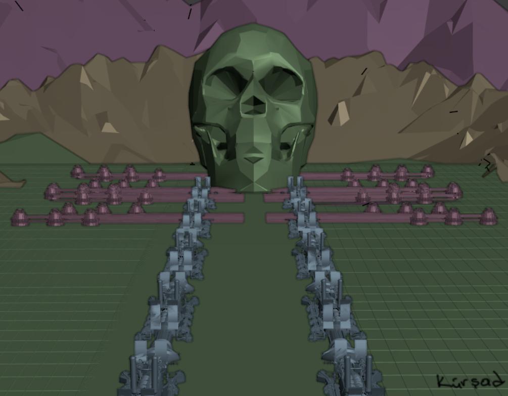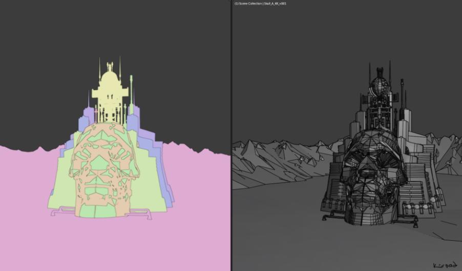 王国宫殿建筑的主要设计目标是营造出威胁感十足且略带书呆子气息的外观。这就是为什么我想在宫殿模型中加入骷髅形状。我用的是几年前扫描的树脂头骨的3D扫描。然后我把网格导入到 Blender,开始玩弄它。骷髅的原始形态太自然且曲线优美。毁灭修正值对去除一些形状很有帮助。经过一些额外的清理,我终于做出了一个建筑风格的骷髅形状。